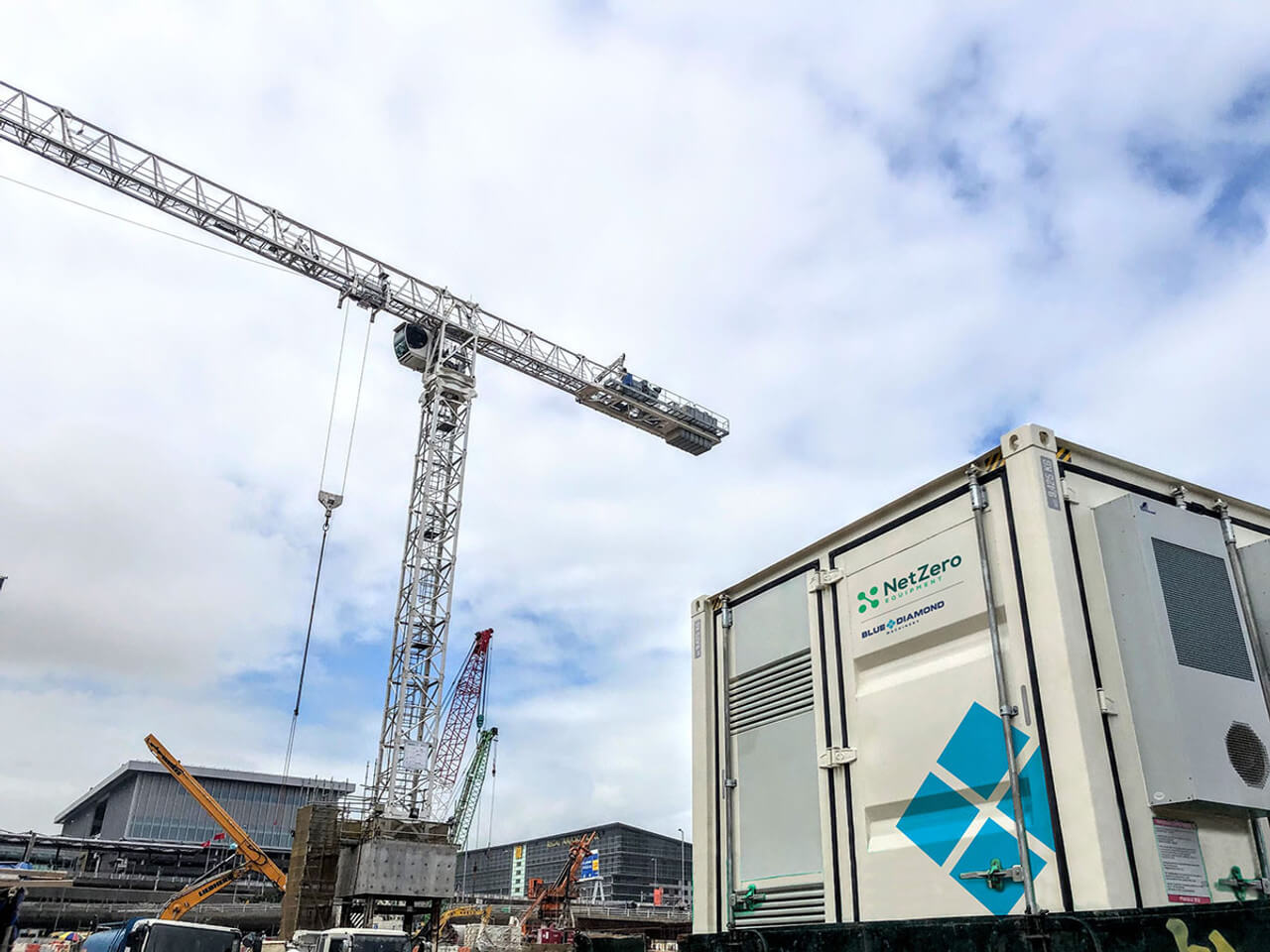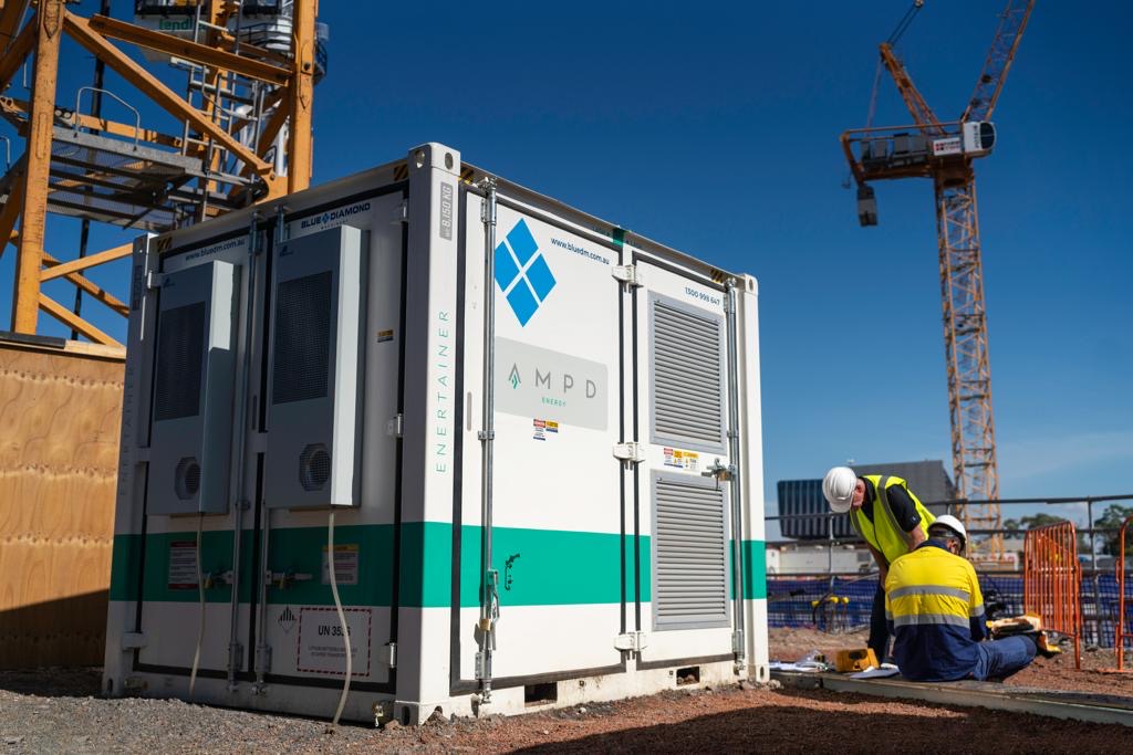 ConstructionBlue Diamond Machinery supplied AMPD’s 500kW Enertainer unit to ensure reliable, large-scale power. The AMPD Enertainer is able to provide power to successfully operate on-site tower cranes without relying on a diesel generator or the electrical grid. Worker’s experience stable, clean and long-term solution to power generation while helping LendLease reach their carbon reduction targets.Â
